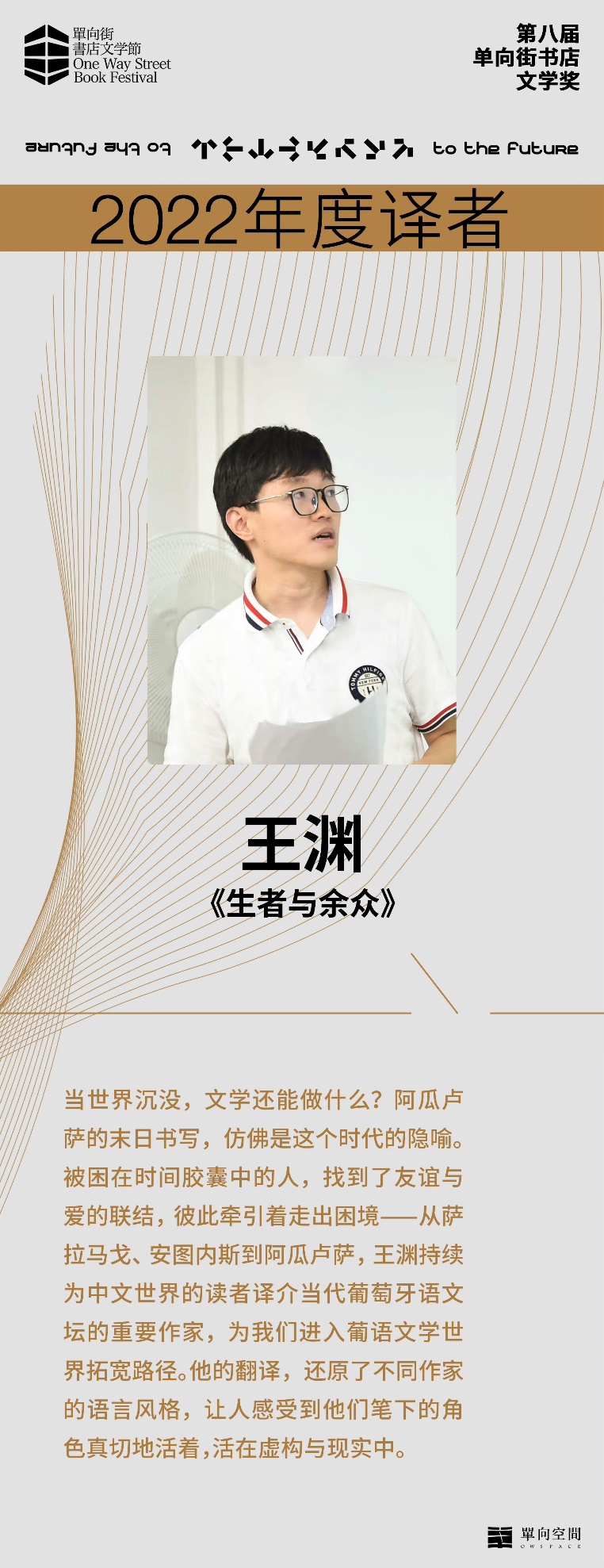 2023年3月25日,第八届单向街书店文学奖揭晓。乐动在线王渊老师荣获2022年度译者,以表彰他对葡语文学译介及推广所做出的贡献。