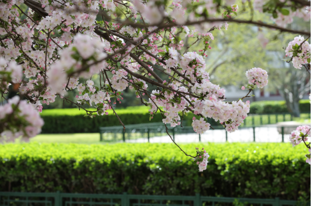 四月的帝都莺飞草长春意盎然,告别了雾霾、沙尘和冰雹,春天如约而至。校园里的腊梅、迎春、连翘、樱花、玉兰、榆叶梅、桃花等竞相开放,春色满园美不胜收,外文楼前的西府海棠本周也开始怒放了,每每此时,满树的海棠花吸引人们驻足观赏,纷纷拿出“长枪短炮”各种拍照神器取景留念,成为春季校园里的一大盛景。