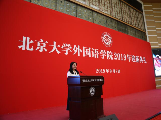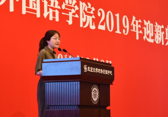 在热烈的掌声中,院长宁琦教授为2019新生送上开学寄语。宁老师首先代表学院全体师生员工祝贺并欢迎新同学成为北大外院的一份子。随后她从时间和空间两个维度带领大家走近和认识外院。从京师同文馆到京师大学堂,从英语系、东语系、西语系、俄语系的建制到外国语学院成立,北大外语学科一路走来,始终用“爱”表达对北大与国家的拳拳深情;外文楼、民主楼与外院新楼之间的纵横寓意着“学贯东西”、“博古通今”,而更广阔的空间意义上,全世界人们的一切表达与一切生活,都是外院人关注、学习与研究之所在。