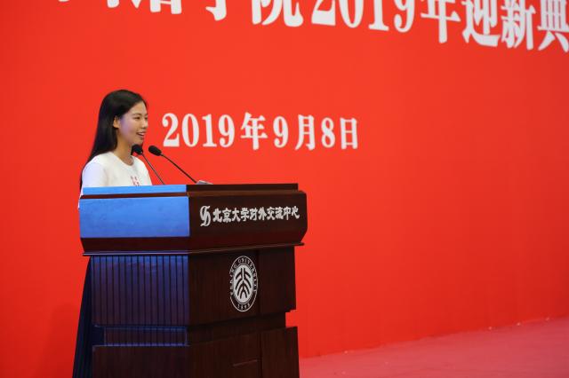 2019级英语系乐动在线郭若菲代表本科新生发言。她认为,正是因为向上的信念,大家才能在燕园里相遇,共同书写青春故事。她表示,新一代的外院人将传承前辈们的辉煌火炬,像一代代外院人一样以语言为舟楫,架起文化沟通的桥梁,完成时代赋予北大外院人的使命。
