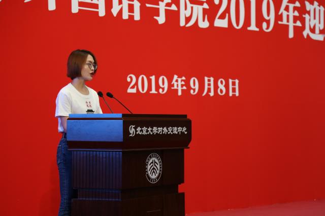 德语系2017级硕士生何凤仪代表在校生发言。她分享了六年来在外院学习的特点,讲述了这之中的向往与迷茫。她鼓励新同学从自己的向往与迷茫中汲取前进的动力,充实、热情地生活。