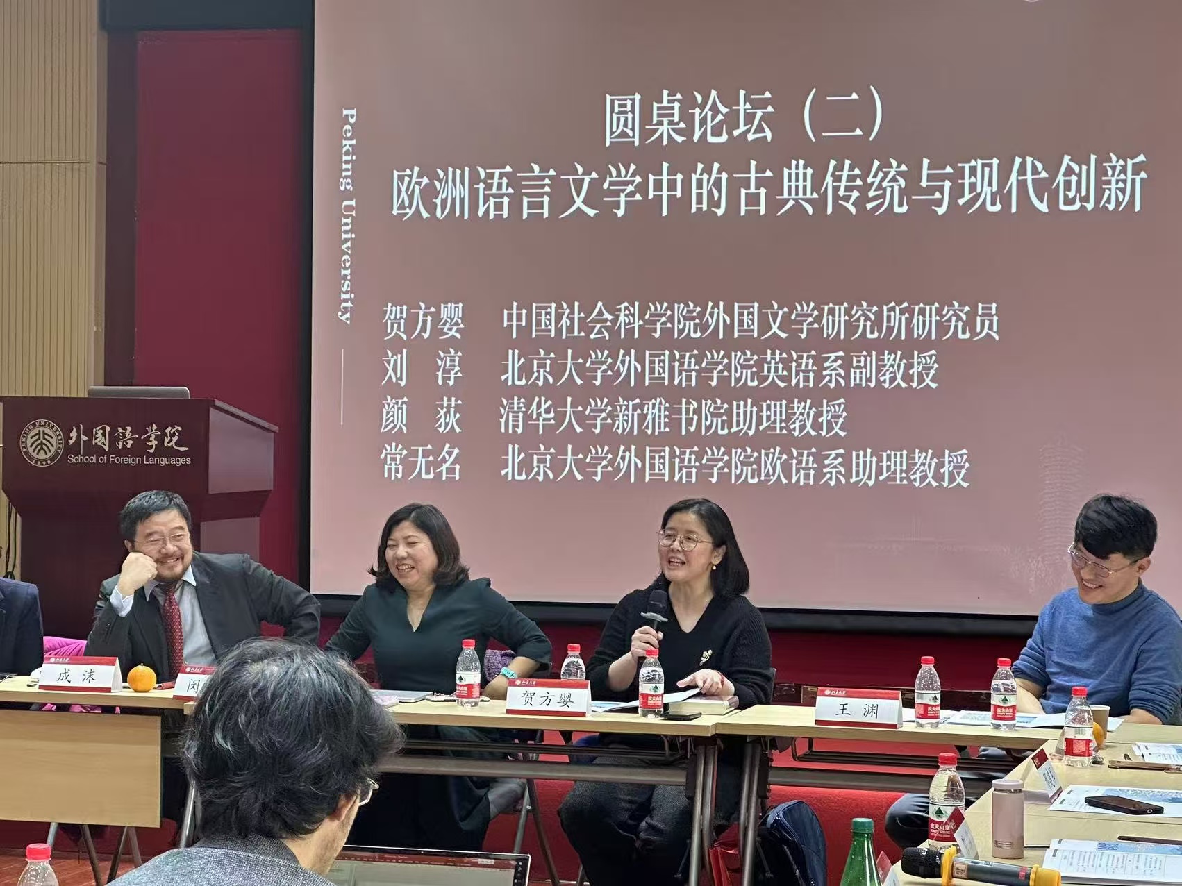 第二场圆桌论坛的主题为“欧洲语言文学中的古典传统与现代创新”。中国社会科学院研究员贺方婴强调了欧语系为古典学研究带来的新机遇;英语系副教授刘淳强调古典传统的现代价值;清华大学新雅书院颜荻教授提出学科边界模糊化的积极影响;助理教授常无名分享彼特拉克研究成果,力倡古典与现代文学的融合。