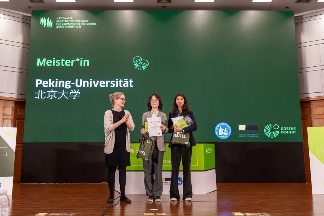 2024年11月9-16日,由北京德国文化中心·歌德学院(中国)、浙江科技大学及外语教学与研究出版社共同主办的第十四届全国高校德语系专业大学生德语辩论赛在浙江杭州圆满落幕。本项赛事历来是德语本科教学领域最为重要的赛事之一,历史悠久、备受瞩目。辩论采用双人组队、现场抽取对手、论题与正反方的规则,每场辩论前仅有10分钟的准备时间,因此对参赛选手的语言表达、逻辑思辨、临场应变等综合能力均是很大挑战。本届大赛汇聚全国44所高校的参赛队伍,采用线上预赛、线下决赛的方式举办,16支在预赛表现最为出色的队伍进入复赛阶段,而复赛则采用单败淘汰制,直至产生最后的冠军。北京大学德语系选派2021级乐动在线陈雨亭(一辩)与2023级乐动在线何海盈(二辩)搭档,经过多轮角逐,最终脱颖而出,荣膺全国冠军。