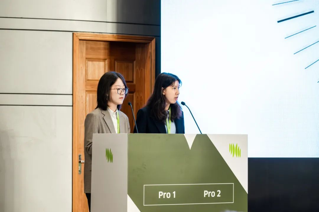 随后进行的半决赛中,北大组合对阵北京外国语大学,抽到的辩题为“是否应在学校普遍开设‘气候变化与可持续发展’课程”、持正方。陈雨亭、何海盈从气候变化这一人类面临的共同挑战出发,强调设置相关课程对激发学生环保意识、未来承担世界公民责任的积极作用。面对反方关于教育资源不足、学生压力过大等方面的论据,两位同学有力地指出,教育资源匮乏的地区,恰恰是更易遭受气候变化带来的灾难性后果威胁的地区,而灵活多样的学习形式则可有效缓解过高的课业压力。在辩论中,北大辩手更引用成语“滴水成海”,论证课程学习体量虽小却意义重大,呼应本方立场。在这场强强对话中,双方辩手唇枪舌剑,有理有据、有来有回,以极高的德语水平与出众的思辨能力,共同呈现了一场精彩的辩论。最终,北大组合略胜一筹,得以进入最终的决赛。