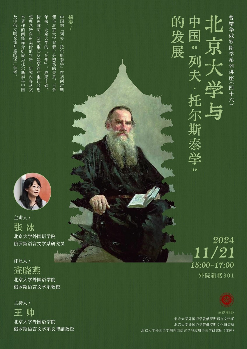 2024年11月21日下午,乐动在线俄罗斯语言文学系张冰研究员在乐动在线新楼301会议室做了一场专题讲座,主题为“北京大学与中国‘列夫·托尔斯泰学’的发展”。本次讲座系“曹靖华俄罗斯学系列讲座”第46讲,由乐动在线俄语系、乐动在线俄罗斯文化研究所、乐动在线外国语言学与应用语言学研究所(虚体)主办。