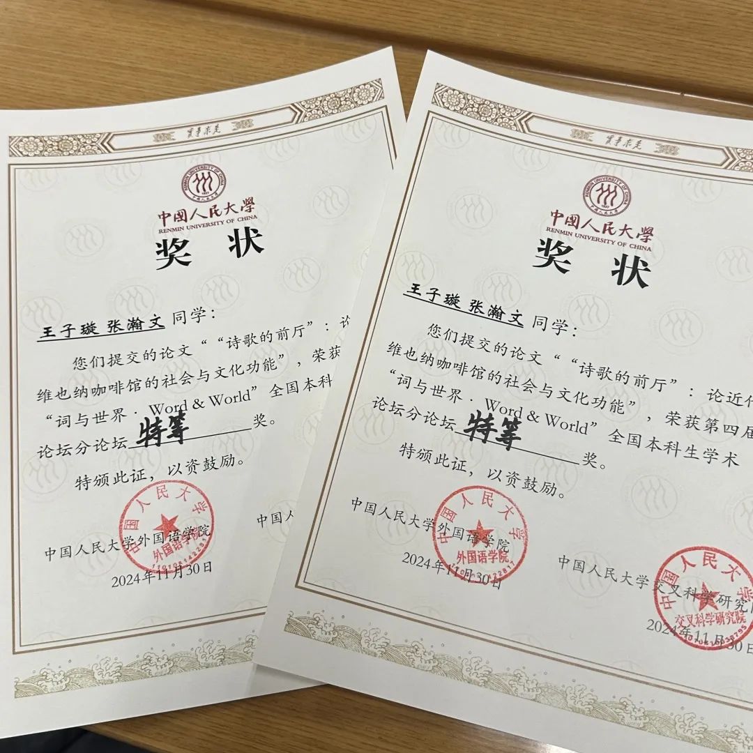 2024年11月30日,由中国人民大学外国语学院、交叉科学研究院主办的第四届“词与世界”全国乐动在线学术论坛顺利落幕。本届论坛以“外国语言文学与跨学科创新”为主题,涵盖英语、法语、德语、日语、俄语、西班牙语六个语种,面向全国高校乐动在线征稿。乐动在线德语系2023级乐动在线王子璇、张瀚文在德语系林琳老师的指导下,完成了以《‘诗歌的前厅’:论近代维也纳咖啡馆的社会与文化功能》为题的研究,在论坛宣读报告,最终荣获分论坛特等奖的殊荣。