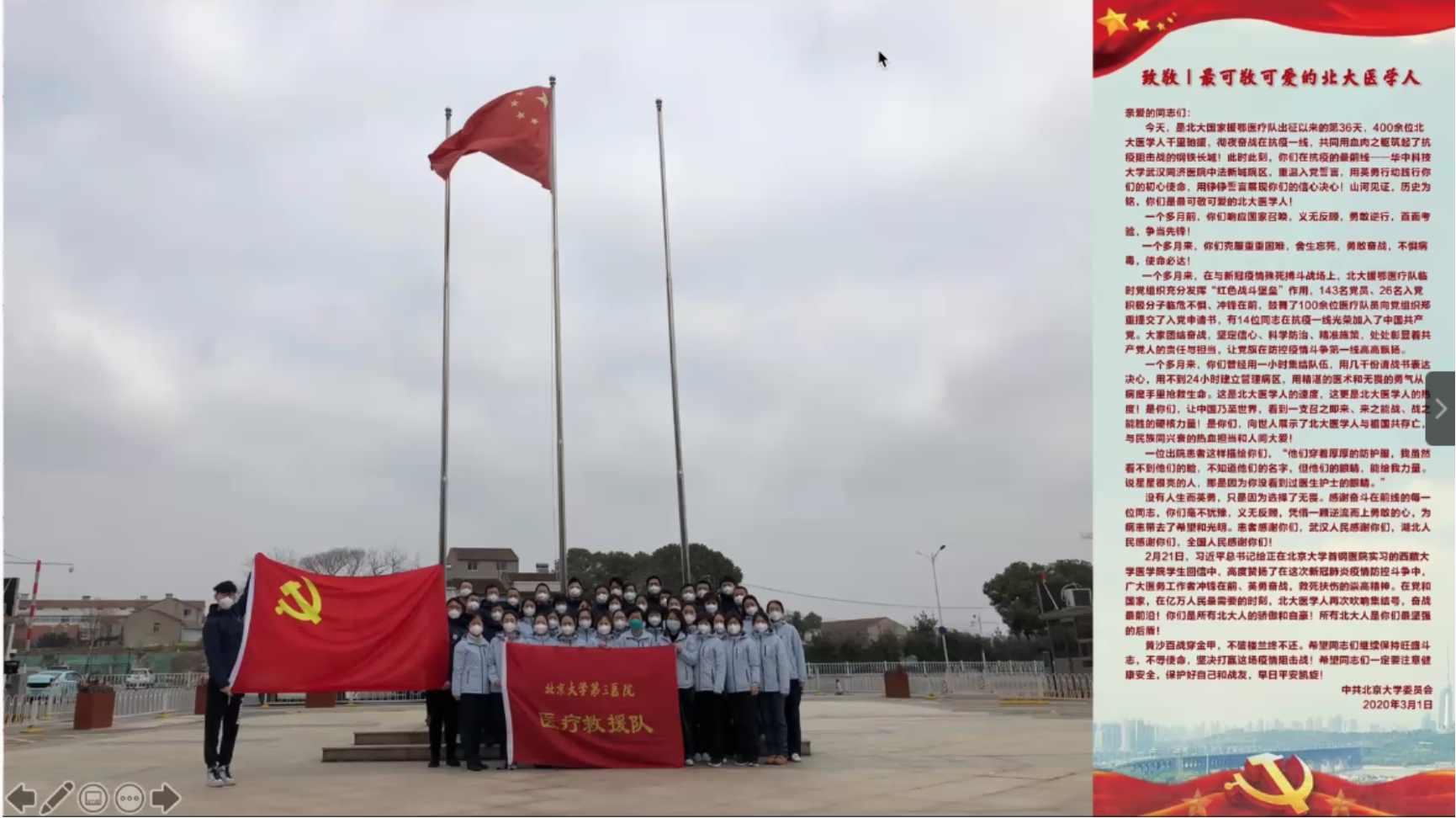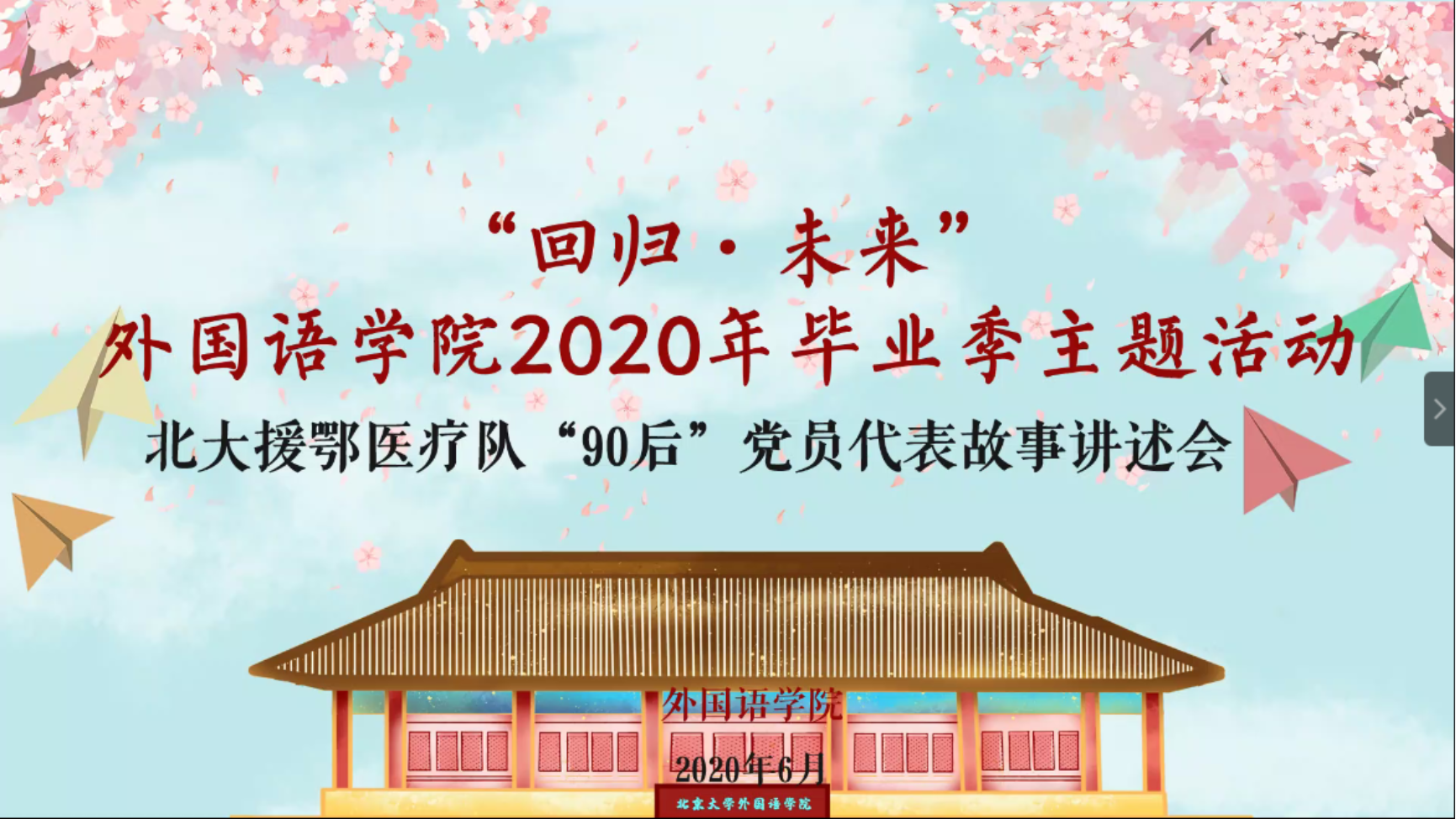 6月23日晚,外国语学院通过线上的方式举办了“回归·未来”外国语学院2020年毕业季主题活动,给毕业生们上了毕业的最后一节公开课。会上特别邀请到北京大学援鄂医疗队“90后”党员代表、北医三院医务处庄昱老师分享他在援鄂期间的经历,以及习总书记回信背后的故事。外国语学院党委书记李淑静老师、党委副书记王恒老师,以及毕业年级、非毕业年级的同学们共同参加了此次活动。活动由乐动在线团委书记卢敏老师主持。