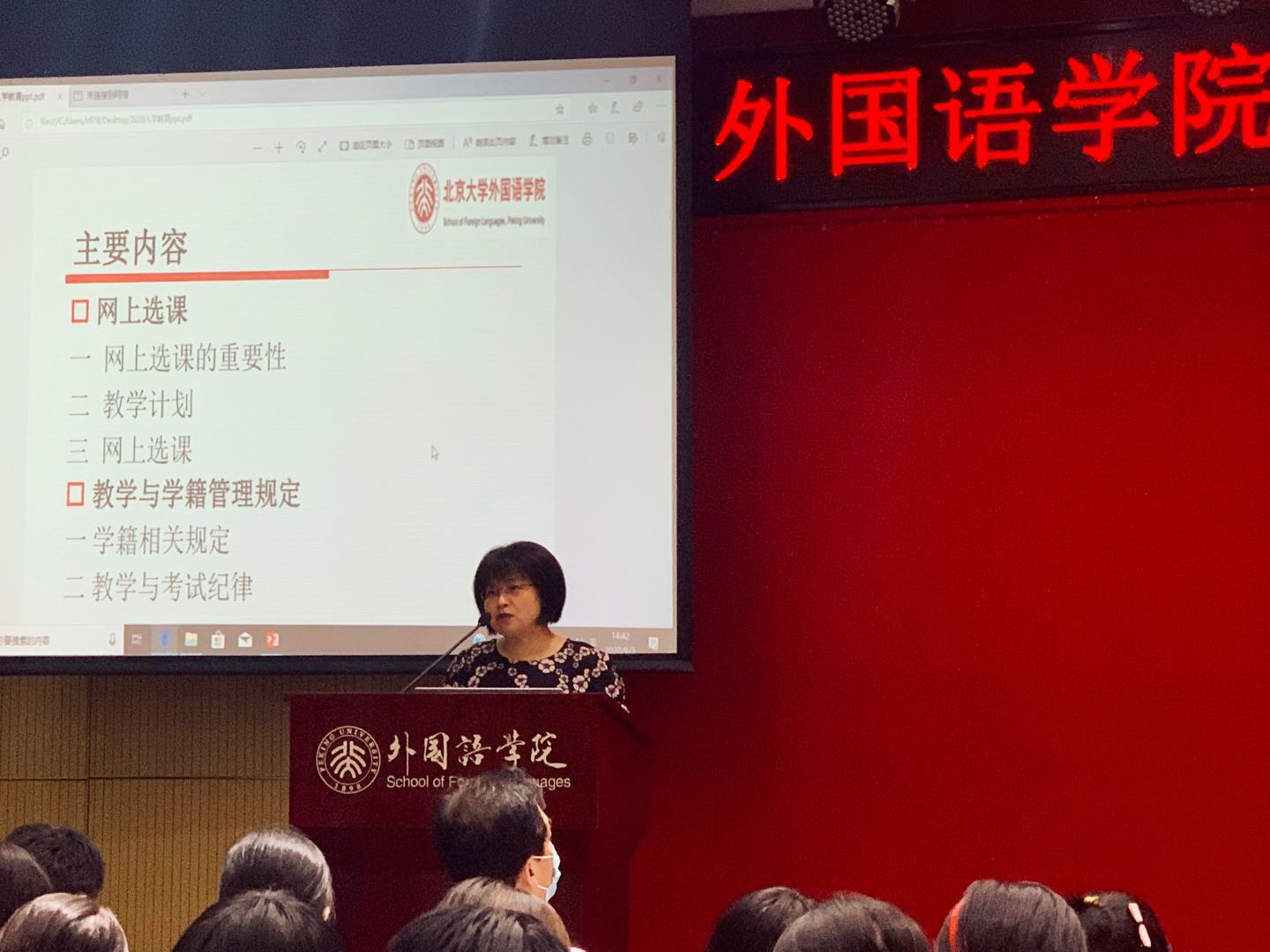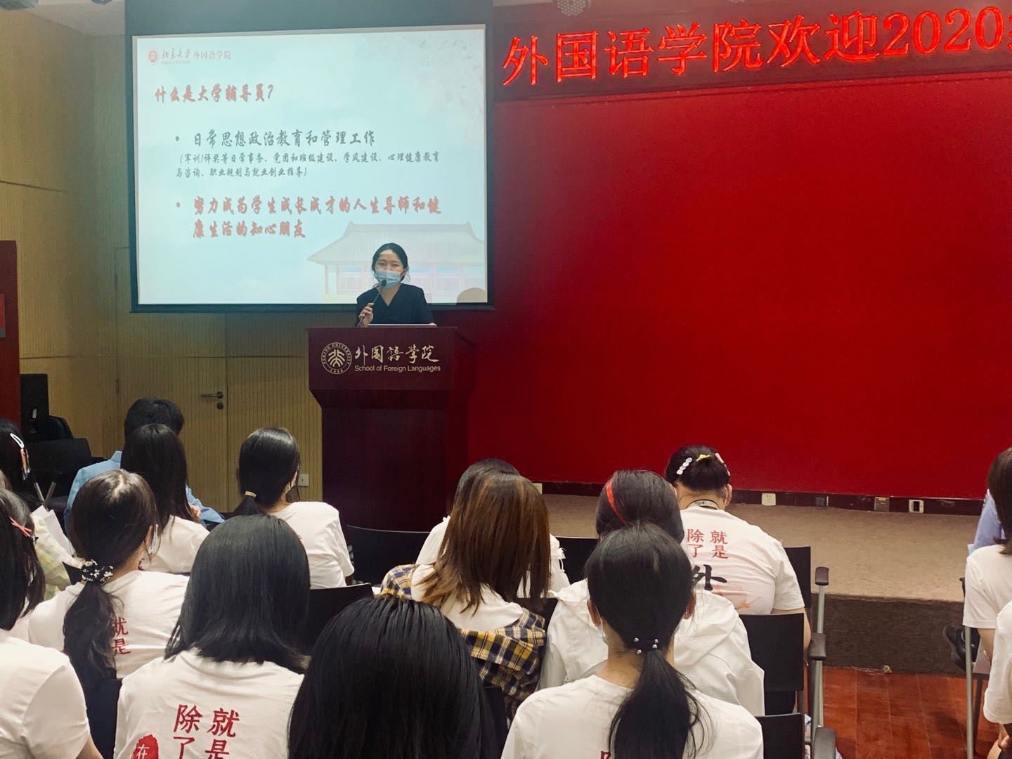 9月3日晚,外国语学院2020级本科新生见面会暨军训动员会在外国语学院新楼501召开,院长宁琦,党委书记李淑静,副院长付志明,党委副书记王恒出席会议,燕园派出所崔金忠警官,教务办公室崔桂红、邵晓梅、李宁,各新生班主任,军训领队教师王渊、范银天、孟聃,院团委书记卢敏,专职辅导员于丹,选留辅导员王乃懋、王志峰及2020级全体本科新生参加会议。会议由于丹主持。