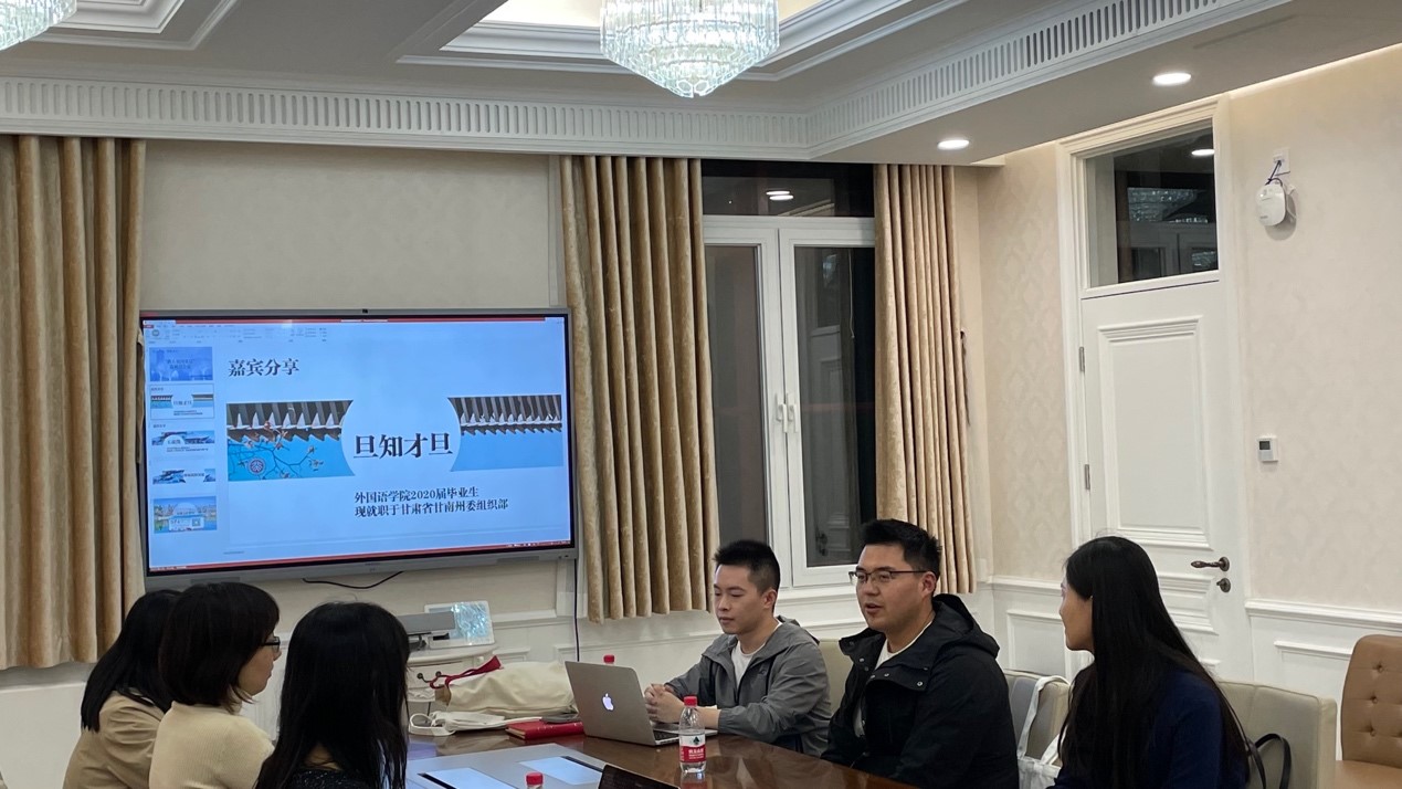 为帮助同学们更好地了解地方选调生的工作情况,外国语学院推出“暖心计划,领航未名——‘我在祖国基层’选调报告会”系列活动。2021年10月15日晚,现就职于甘肃省甘南州委组织部的旦知才旦学长和就职于杭州市文广旅游局国际交流与推广处的王凌凯学长为大家分享了自己的选调经历。外国语学院团委书记卢敏、辅导员丁尧,以及十余名外院学子参加了此次报告会。