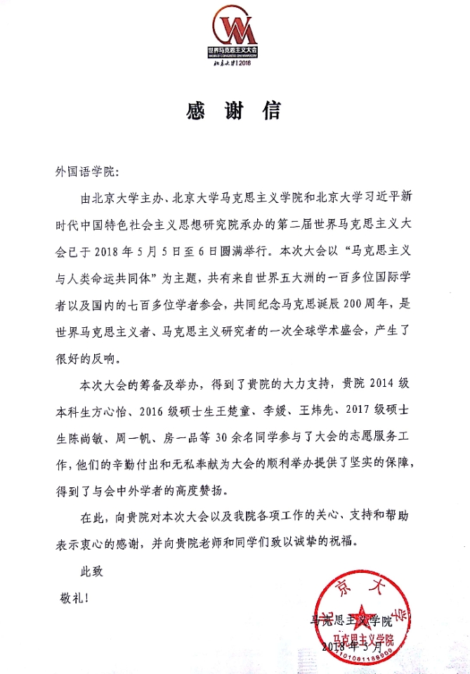 期间,外国语学院师生高度重视并支持此次盛会,积极投身语言翻译及志愿者招募工作,获得主办单位高度评价。据统计,2014级乐动在线方心怡、2016级硕士生王楚童、李媛、王炜先、2017级硕士生陈尚敏、周一帆、房一品等30余名同学参与了大会的志愿服务工作,他们的辛勤付出和无私奉献为大会的顺利举办提供了坚实的保障,得到了与会中外学者的高度赞扬。马克思主义学院特发来感谢信,对他们的支持和帮助表示衷心的感谢。