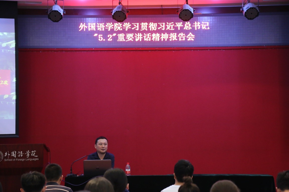 6月1日下午,外国语学院在新楼501报告厅召开习近平总书记在北京大学师生座谈会上的讲话精神学习报告会。会议邀请北京大学政策法规研究室主任任羽中研究员做主题报告。学院党委副书记王恒、团委副书记邹雨浓、冯一帆及近百名学生党员参加学习,报告会由院团委书记王艳超主持。